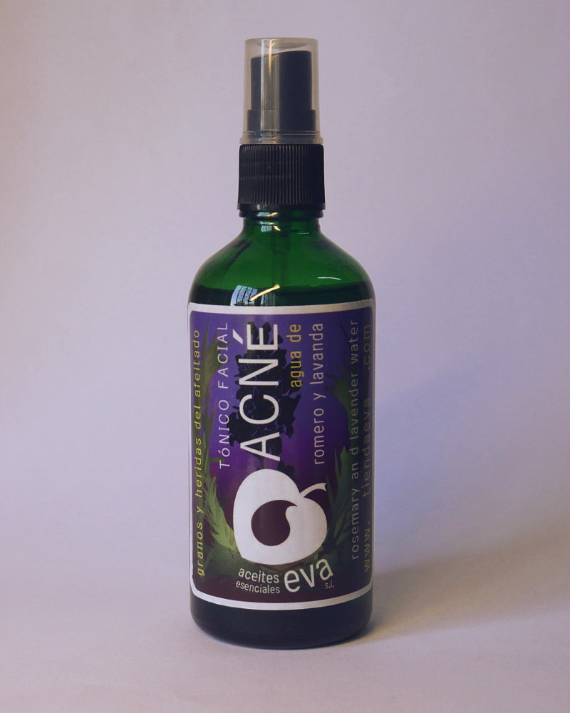 Acné es un tónico que calma y repara las heridas faciales del acné, del afeitado y de la sensibilidiad de la piel producida por el frío, el sol, el roce de las mascarillas o el afeitado. También es indicado para alérgicos y pieles atópicas porque solo tiene Lavanda y Romero.